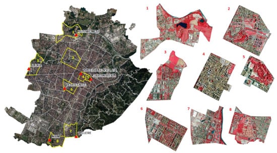 The development of cities, with the consequent use of territory and the increase in built-up areas, causes some environmental issues, such as the urban heat island (UHI) effect, which is able to increase the air temperature by 2%–5% in a city, affecting noise and air pollution, and storm water run-off [1]. Buildings are one of the main contributors toward increments in the local urban air temperature [2]. UHI mitigation has become one of the priorities of the European Union, which has promoted green infrastructure using policy initiatives and incentives in order to reach sustainable and resilient cities [3]. Various UHI mitigation strategies may be used to improve the indoor and outdoor thermal comfort in urban areas [4]. For example, the absence of vegetation in a high-density urban context is one of the factors that contribute toward the increase in urban air temperatures. Green roofs could represent a solution for the development of resilient urban cities as they promote the mitigation of the microclimate, energy savings, reductions in atmospheric and sound pollution, reductions in the water runoff speed, the growth of biodiversity, better performances of photovoltaic coverage panels and social and economic benefits [5]. Covering roofs with vegetation helps to mitigate the UHI effect by modifying microclimate and local climate [6]. A map can be created, through an analysis of the land cover, to identify green urban spaces, such as parks, playgrounds and residential green areas [7]. Moreover, through the use of a geographic information system (GIS) tool, it is possible to analyze the presence of vegetation according to the availability of the data. An analysis of the green spaces in urban contexts is essential for urban planning to identify sustainable policies in order to improve the quality and comfort of indoor and outdoor spaces in a city [8]. In order to assess the sustainability of a neighbourhood or a city, it is possible to refer to environmental protocols, such as the LEED (leadership in energy and environmental design) protocol. LEED introduces a weighting system which, on the basis of several indicators, allocates points according to the ability to reduce environmental problems. For example, the solar reflectance index (SRI) is used to minimize the effects of UHIs on microclimates and on human and wildlife habitats.