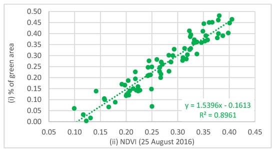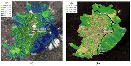 - The percentage of green areas was investigated for the whole city, by calculating the normalized difference vegetation index (NDVI) from satellite images (Landsat 8 with a precision of 30 m). NDVI was calculated by selecting satellite images for the months of January (21st, 2016) and August (25th, 2016) from the ‘Earth Explorer’ website. Images with limited cloud cover over the sites were selected, and in this case the percentages of cloud cover were 3.8% and 0.8%, respectively. According to [22], NDVI is a simple but precise indicator that can be used to identify the presence of vegetation, and it is calculated with Equation (1). As far as the Landsat 8 images are concerned, the spectral bands used to calculate NDVI are band 4 (red) and band 5 (near infrared). The NDVI values vary between −1 and +1, and Table 3 describes the NDVI values that correspond to the various surface characteristics.where: