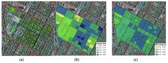 - The spectral information available from the orthophotos (RGB and IR) allowed the green areas to be separated from the areas covered with other materials. Through the use of the Feature Analyst (FA) tool [35], an extension of ArcGIS 10 (ESRI), it is possible to extract green areas as a function of the color tones. Feature Analyst (FA) is an application that allows to classify and extract different materials according to color tones [6]. The greening rate was mapped and quantified with this method using orthophotos with a precision of 0.10 m. Because of the high level of accuracy of the data (which led to a significant increase in the simulation time), this analysis was only carried out on eight areas in the city of Turin (not the whole city).