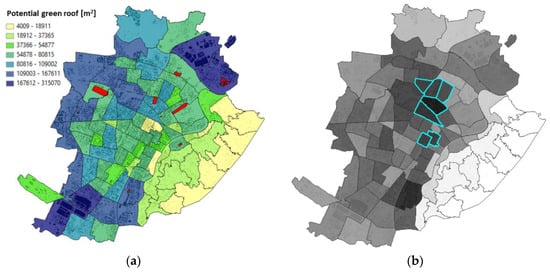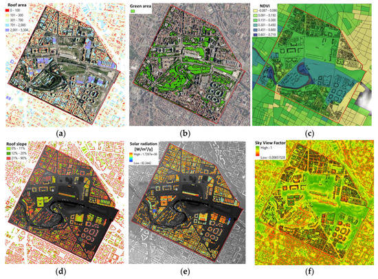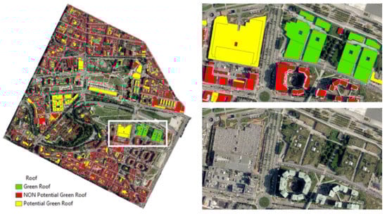 - Finally, the characteristics of the roofs were overlaid to consider all the criteria. With this procedure, the potential green roofs were identified, and the roof areas were computed by considering the geometrical characteristics of the built environment and the microclimate conditions.