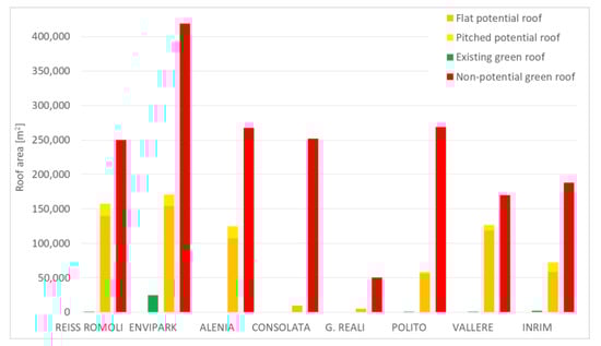 The potential of green-roof retrofitting depends on the cover material and the physical aspects of the roof, such as the available surface and inclination. In addition, the local built environment plays a significant role in urban areas, due to the shadowing effects of the surrounding buildings. These effects are important for the selection of the most appropriate plant species for green roofs. The following criteria were identified, on the basis of these aspects, to select the existing and potential green roofs: a larger roof area than 100 m2, the roof material (green, no red tiles), a roof slope of less than 11° for flat roofs and 20° for pitched roofs and more than 3 h of sunlight (sunny roofs). The building roofs were thus classified into three typologies: existing green roofs, potential green roofs, and non-potential green roofs.