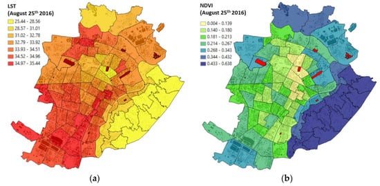 As already mentioned, green areas improves the aesthetic value of urban context reducing the UHI effect and achieving comfortable microclimate and climate conditions [13,14,15,16,17,18]. The urbanization plays a key role in UHI expansion, an analysis of land cover types is critical for the outdoor spaces assessment in order to improve the thermal comfort, liveability and air quality of an urban environment [19]. Outdoor thermal comfort varies according to morphological context [16,17], and any increase in the environmental air temperature is influenced to a great extent by the thermal characteristics of buildings and urban surfaces [20]. For example, built surfaces (often characterized by low albedo values) absorb and store solar energy during the daytime and release such stored thermal energy during both the day and night [13]. The vegetation cover reduces LST, and any vegetative surfaces such as parks and forest reserves should be preserved in cities [21].