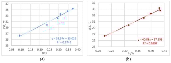 The urban microclimate is also affected by the shape and orientation of the streets, and the heights and density of the neighbouring buildings [23]. Several studies [15,24,25,26,27,28,29] have examined the relation between common morphological parameters, that is, the canyon height-to-width (H/W) ratio, the length-to-width (L/H) ratio, the sky view factor (SVF), the building coverage ratio (BCR), the building density and thermal comfort sensations using thermal indexes, such as physiologically equivalent temperature (PET) [20]. Sharmin et al. [15] examined the impact of the microclimate on outdoor thermal comfort through two approaches. One approach investigated the correlation between the environments and a thermal sensation vote measured at the same time; an alternative approach used a standard thermal index to estimate the thermal sensation of the people comparing this with the objective measurements. Muniz-Gäal et al. [24] evaluated the thermal comfort conditions of urban canyons by considering the variations in three urban variables: the H/W ratio, the L/H ratio and the space between buildings. Their results shown that with higher values of H/W ratios, the wind speeds and shading from buildings increased, decreasing the variation in thermal comfort sensation during the day (with low peak PET values), and improving thermal comfort at a pedestrian level. Rodríguez-Algeciras et al. [25] confirmed that the street geometry (H/W ratio) has a significant effect on the outdoor thermal comfort. Emmanuel et al. [26] also found that, in street canyon conditions, the maximum daily temperature is inversely proportional to the H/W ratio. The presence of shade, that increased through the increased of H/W ratios, allows to improve outdoor thermal comfort, and high albedo values at a street level leads to a lowering of the air temperature. Other studies [4,28,29] investigated the shading effects using the SVF, which defines the percentage of visible sky at specific positions. They found that the SVF significantly affects outdoor thermal environments. High SVF values cause discomfort in summer, and contrarily low SVF causes discomfort in winter. Ahmadi Venhari et al. [4] confirmed that there is a significant and positive relationship between SVF and PET values.