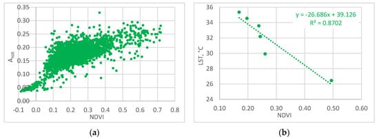 - The types of reflective surfaces were assessed by calculating three albedo indicators: visible, near-infrared and short-wavelength. According to [38], linear Equations (3)–(5) were used to calculate the albedo of the outdoor surfaces using Landsat 8 (OLI/TIRS) images for two months in the year 2016 (January and August). For the short albedo (Ashort), five bands (2, 4, 5, 6, and 7) were used to predict the total shortwave albedo; for the visible albedo (Avisible), three visible bands (2, 3 and 4) are sufficient to predict the broadband albedos; and three bands (5, 6, and 7) were used for the near-IR albedo (ANIR). The albedo values vary between 0 to 1, for vegetated land, the visible albedo is small and the total shortwave and near-IR albedos are large [39]; in these equations, α represents the Landsat bands:
