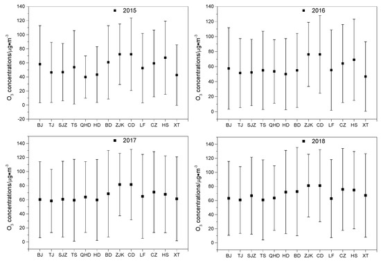 The annual concentration of O3 was 62.25 ± 50.83 μg·m−3 in BTH area from 2015–2018. Figure 2 and Figure 3 showed average annual concentrations of O3 in BTH area. It was mainly on the upward trend, especially in QHD, HD, and XT city. The concentrations had increased by over 50% from 2015 to 2018 in the three cities, while it was the smoothest (8.70%) in Beijing city. Furthermore, the O3 concentrations in ZJK and CD were much higher than other cities in BTH area. Compared with other cities in China [12], the average annual O3 concentration in BTH area was lower than Shanghai (72.1 μg·m−3) and Lasa (80.9 μg·m−3), while it was higher in Nanjing (60.2 μg·m−3), Hangzhou (56.1 μg·m−3), Fuzhou (54.9 μg·m−3), Guangzhou (43.4 μg·m−3), Chongqing (36.2 μg·m−3), and Chengdu (52.9 μg·m−3). Compared with foreign cities, the average O3 concentrations were higher than São Paulo (55.24 μg·m−3) in Brazil [38] and lower than Turkey (89.9 μg·m−3) [54].