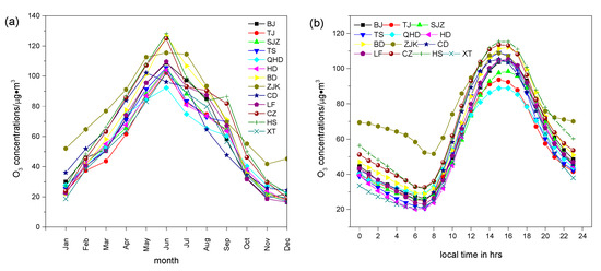 Average monthly concentrations (a) and diurnal variations (b) of O3 in BTH area.