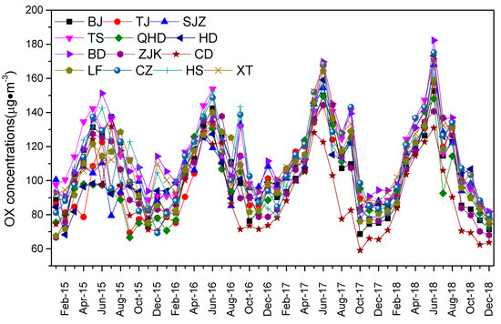 The temporal and spatial changes of OX (OX = NO2 + O3) can be seen in Figure 5. The average OX concentration was 106.15 μg m−3 in this study. By comparison, it was much greater than Canoas (74.23 μg m−3) and Esteio (70.64 μg m−3) in Brazil [58]. The OX concentrations varied in different months and seasons in BTH area. There were obvious peaks of OX concentrations from May to June. Overall, the trends of average OX concentrations were summer (125.25 μg m−3) > spring (118.68 μg m−3) > autumn (92.83 μg m−3) > winter (87.85 μg m−3) in BTH area. Regionally, the average OX concentrations were in order as BD > TS > CZ > XT > HS > LF > SJZ > HD > BJ > ZJK > TJ > QHD > CD. The highest concentration of OX in BD were 1.26 times those monitored at CD. The difference between the two cities was 23.62 μg m−3, which indicated that the atmospheric oxidation was relatively stronger in BD and TS.