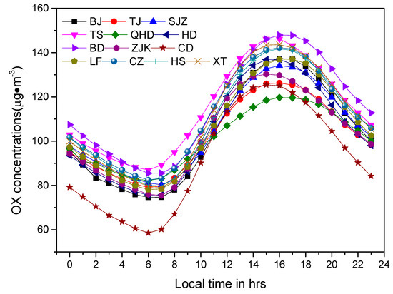 Moreover, the diurnal variations of OX concentrations were distinctive (Figure 6). There was a tendency to ascend from 8:00 and descend at 18:00. The peak values were 118.8–147.93 μg m−3 at 15:00–17:00, which was similar with the results of Tiwari et al. [16] and Notario et al. [24]. The variations of OX concentrations were consistent with O3 concentrations, whereas they were opposite to that of NO2 concentrations (Figure 7a and Table 1). Results of Spearman correlation analysis showed that OX correlated closely with O3 (R2 = 0.895, p < 0.01), while it had a negative with NO2 (R2 = −0.291, p < 0.01) in BTH area. Owing to the enhanced photochemical activity during the afternoon, the O3 and OX maximum was obtained [24]. Thus, the tendency of OX concentrations was more affected by diurnal variations of O3 concentrations, which was associated with the previous study [16].