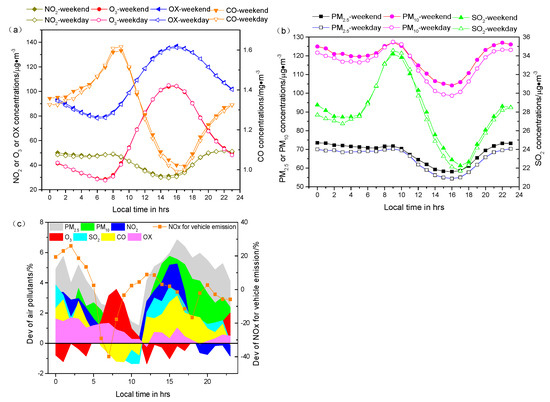 Diurnal variation of O3 and other pollutant concentrations on weekends and weekdays (a–c) deviations of pollutant concentrations between weekday and weekend (the deviations of NOx for vehicle emissions were calculated based on the data from Jing et al. [59] and Song et al. [53]).
