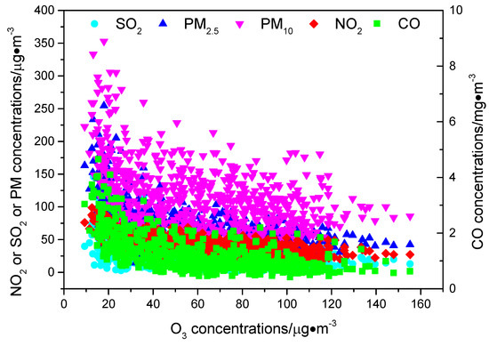 As a whole, the O3 concentrations had a significant negative correlation with particulate matter, NO2, SO2, and CO concentrations (Figure 8 and Table 3) in BTH area. Similar results were obtained by He et al. [12] and Wang et al. [29] that demonstrated the O3 was significantly negatively correlated with its precursors, such as NO2 and CO. Furthermore, aerosols reduced the actinic flux photolysis rates under absorption and scattering, so the surface ozone production decreased [38,44,61]. Nishanth et al. [45] elucidated that it was a negative correlation between daily values of PM10 and O3 concentration. Li et al. [62] demonstrated that O3 concentration was strongly inhibited under the condition of high PM2.5 concentration using the daily PM2.5 and O3 monitoring data.