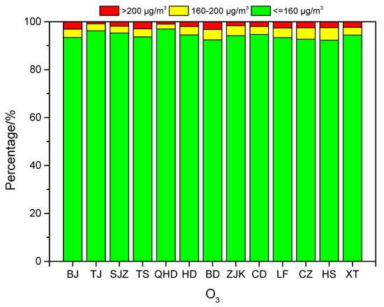 Nowadays, although particulate matter (PM) were primary pollutants in China, photochemical pollution caused by ozone also occurred frequently. As one of national key regions, Beijing-Tianjin-Hebei (BTH) is the center for economic and political development. The haze incidents occurred frequently in the BTH area where the atmospheric pollution was serious [47,48,49,50,51]. According to the China Ministry of Environmental Protection, the O3 concentrations increased from 2015 to 2018 in general. The average daily maximum 8 h of O3 concentrations in BTH area in 2015 and 2018 were 162 and 199 μg·m−3, respectively. The growth rate reached 22.84%. Furthermore, the number of days exceeding the limit of O3 as the main pollutant increased with the vigorous control of particulate matter by the state. The proportion of O3 as the main pollutant was 17.2% in 2015 in BTH, which ranked as the second primary pollutant. In BTH and its surrounding areas, it turned into the primary pollutant with an exceeding rate of 46% in 2018, which increased by 2.67 times, and an exceeding rate of PM2.5 that decreased to 40.7%. Wang et al. [14] pointed that the O3 concentrations exceeded the ambient air quality standard by 100–200% in BTH area. Thus, BTH area was selected as the study area. In addition, it showed a decreasing trend in the number of days exceeding the standard in the whole year. However, the probability of serious and very serious air pollution events decreased, while the probability of light and moderate air pollution events increased. In 2018, the percent of excellent and good air quality level was 50.5% in BTH and its surrounding areas. Secondly, the percent of light and moderate polluted periods was 43.5%. The percent of serious and very serious polluted periods was about 6%. However, more researches were about the characteristics of pollution at heavy pollution or specific periods, few researches were about the characteristics of pollution at other air quality levels.