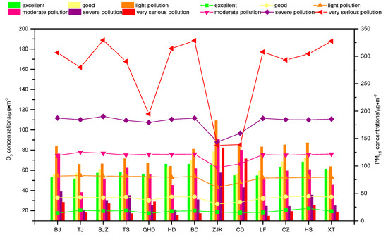 The O3 (histogram) and PM2.5 concentrations (line chart) at different air quality levels.