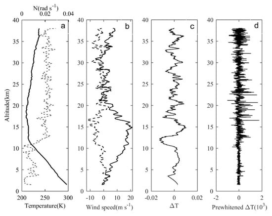 (a) An example of temperature (solid line) and buoyancy frequency (dashed line), (b) horizontal wind speed component (solid line: zonal wind speed component; dashed line: meridional wind velocity component), (c) normalized temperature disturbance component, and (d) pre-whitened normalized temperature disturbance profiles (from left to right) observed on the night of 21 September, 2019 during the balloon ascent.