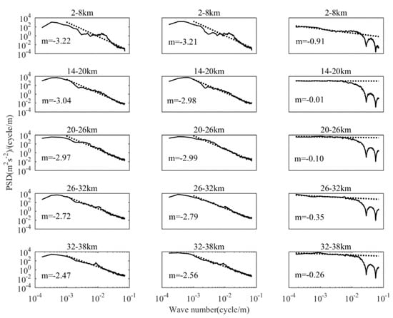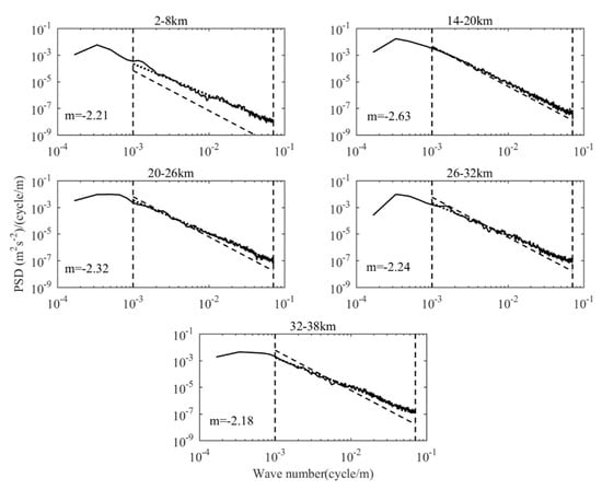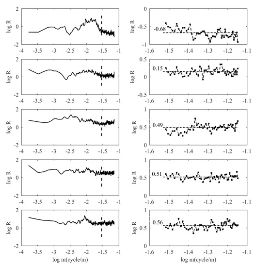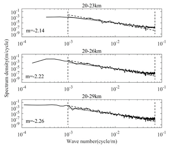 The Fourier transform is applied to the pre-whitened data, and the characteristics of the wavenumber spectrum are characterized by the slope and spectral amplitude. In the wavenumber range of 9.97 × 10−4 7.5 × 10−2 cycle/m, we obtained the slope by first-order linear fitting according to the log-log power spectrum, where 7.5 × 10−2 cycle/m corresponds to half the Nyquist wavenumber (with a resolution of 7 m). In this wavenumber range, the aliasing effect can be ignored. When calculating the corresponding amplitude of the power spectrum, in order to avoid the amplitude swing caused by the change of the actual spectrum slope, the power spectrum density corresponding to the “center of mass “wavenumber [22] is used as the spectrum amplitude: