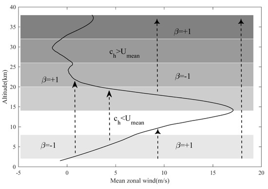 is the background wind field, and is the horizontal phase velocity relative to the ground. Given the vertical profile of the background wind field and horizontal phase velocity, can be obtained. When = −1, the refraction effect caused by “shifting” of the background wind field will increase the intrinsic frequency, resulting in a reduction in the wavenumber, and the variance of the zonal wind speed decreases with height. The “downshifting” effect of the wavenumber spectrum in the large wavenumber region will be generated, resulting in a deeper spectrum slope. On the contrary, when = +1, vertical wavenumber spectrum in large wavenumber region will produce an “upshifting” effect, the spectrum slope decreases, and the zonal wind speed oscillation increases with altitude. The specific effect can refer to Figure 3 in [12].