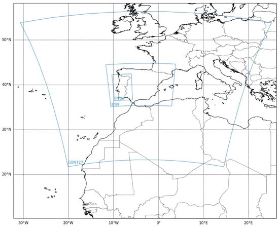 The WRF-CHIMERE modelling system is applied for the whole of 2016 considering three nested domains, depicted in Figure 1. High-resolution simulations were performed, using a coarse domain covering Southern Europe and Sahara Desert with a horizontal resolution of 27 × 27 km2 (CONT27); a second domain covering the Iberian Peninsula with 9 × 9 km2 of horizontal resolution (IP09); and the inner-most domain covering mainland Portugal, with 3 × 3 km2 (PT03). The vertical resolution in CHIMERE varies upward in a geometric progression. The lowest atmospheric layers are more refined, since these layers are critical for the modelling of boundary layer contamination, particularly in urban areas, but also in marine areas, in order to model the sea-salt emissions correctly, and in arid areas, for mineral dust emissions []. Although the most frequently used vertical discretization consists of eight vertical levels [], in present simulations, a better representation of the free troposphere is employed, using 24 levels up to the 200hPa pressure level. The first model layer, which is closer to the surface, has a thickness of 3 hPa, about 30m. With this vertical discretization, we aim to reproduce the long-range transport of dust from North Africa better, as suggested by Menut et al. [].
