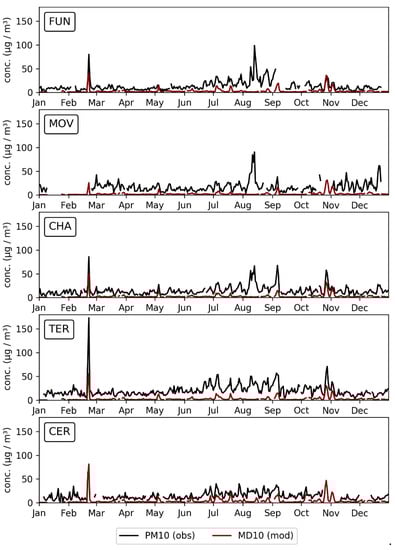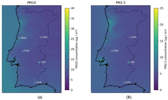 The comparison between model results and observations, in terms of PM10 and PM2.5 annual means, is presented in Figure 2. The background levels are reasonably captured by the model in all monitoring stations, but TER. Mean differences (or bias) between modelled and observed concentrations are approximately 5 µg·m−3 for PM10 and 2 µg·m−3 for PM2.5, in CER, CHA, FUN and MOV. TER exhibits differences of 13 µg·m−3 for PM10 and 8 µg·m−3 for PM2.5. Among the five rural background monitoring stations included in this study, TER has the highest observed PM10 and PM2.5 mean concentrations. Its PM10 and PM2.5 mean concentrations are more than 5 µg·m−3 higher than the ones measured in FUN, CHA or CER. The TER monitoring station is located in Alentejo Interior, a predominantly arid region, with land use and land cover which may contribute to particulate resuspension and increase PM concentrations in the region.