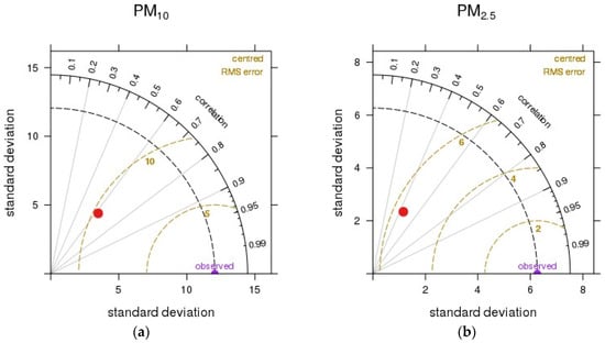 To assess model agreement with observations on a daily basis, Taylor diagrams [] relative to the mean background concentrations (e.g., daily average concentrations among the five monitoring stations) are presented in Figure 3. The Taylor diagram is one of the more useful methods for evaluating model performance, since it provides a way of showing simultaneously how three complementary model performance statistics vary: The correlation coefficient (r), the standard deviation (sigma) and the root-mean-square (RMS) error. Correlation between modelled concentrations and observations is 0.6 for PM10 and 0.4 for PM2.5. This means that on a yearly basis, CHIMERE reproduces better the temporal variability across Portugal of PM10 than PM2.5. Standard deviation and root mean square error are, in absolute values, higher for PM10 than PM2.5, which is related to the higher PM10 daily values in comparison to PM2.5.