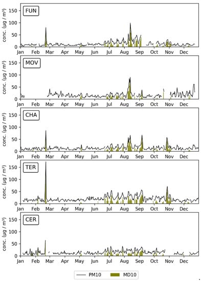 Currently, one of the official methods [] adopted by the European Commission for evaluating the occurrence of African dust outbreaks and quantifying their contributions, and the one adopted by the Portuguese Environment Agency, is a statistical approach based on the variability at rural background sites [] (hereafter referred to as P40). It is based on the application of a 30-day moving 40th percentile to the PM data series in rural background stations, after excluding those days impacted by African dust, which must be previously identified based on satellite observations, model back-trajectories and/or dust forecast models. The feasibility of this method was demonstrated by comparing experimentally measured concentrations of the mineral matter determined at three Spanish rural background sites (Monagrega and Montseny, both located in the Eastern part of the Iberian Peninsula, and Bellver, located in the Balearic Islands) versus the estimated African dust contributions obtained by this procedure.