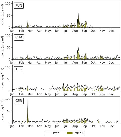 In terms of mean values of African dust contribution to PM2.5 (taking into account days with a contribution higher than 1 µg·m−3 only), FUN has the highest mean value (about 11 µg·m−3). However, this fact must be taken carefully, since FUN has the lowest number of days with AD2.5 ≥ 1 µg·m−3, and mean values are calculated for those days only. This happens because, as illustrated in Figure 5, FUN only has PM2.5 data until September (although there are valid observations for PM10 during the rest of the year). However, according to Reference [], and as seen in Figure A1, there are still 31 potential days from October to December that could add to the 48 days identified for AD2.5.