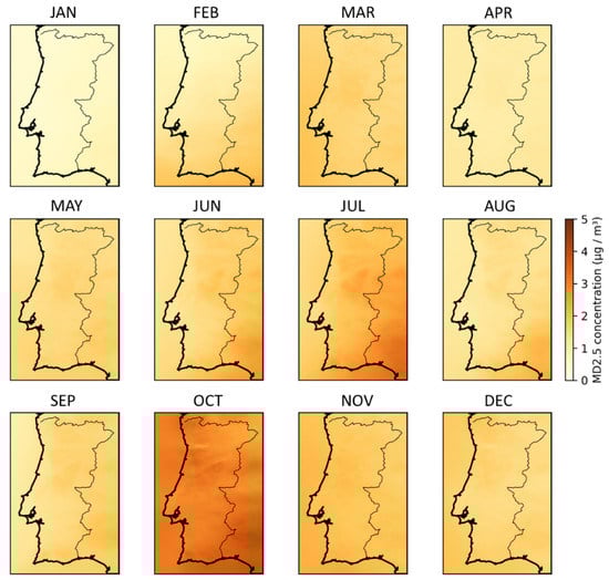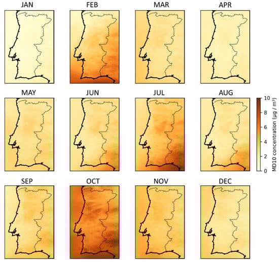 For PM2.5, during October, the contribution estimated by the model, is also higher than during the other months. African dust contributes, on average, during this month, with between 2 and 4 µg·m−3 to PM2.5 concentrations. During January, the contribution is the lowest, with mean values lower than 1 µg·m−3 throughout Portugal.