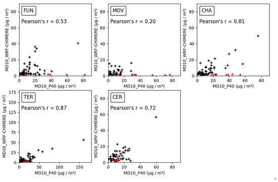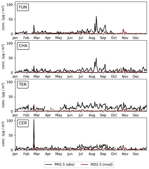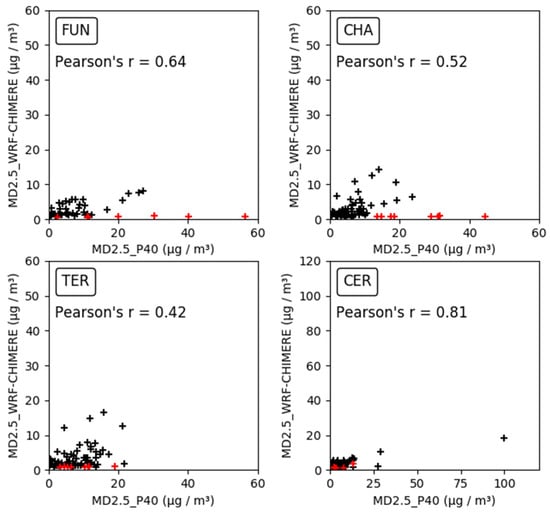For PM10, excluding red points, the estimates from both methodologies are quite in accordance for the African dust fraction (Figure 10), especially for TER (Pearson’s r = 0.87), CHA (Pearson’s r = 0.81) and CER (Pearson’s r = 0.72). Nevertheless, the model-base methodology estimates are, in general, lower than the P40 ones, especially for TER (bias = 11.1 µg·m−3) and CHA (bias = 6.8 µg·m−3), for which the bias values calculated excluded the red points. During specific episodes, large differences may be found between estimates: For example, for TER, on 22 February, a contribution 161 µg·m−3 of dust to PM10 concentrations is obtained with the P40 method, against a contribution of 56 µg·m−3 according to the model results. Both estimates imply, however, the surpass of the daily limit value for the protection of human health. From the analysis of the scatter plots, CER appears to have the best agreement between the two methodologies. Note, however, that this station has no available data during 22 February, when PM10 concentrations were very high (a daily mean concentration value of 104 µg·m−3 was observed in this station for PM2.5, and a contribution of nearly 100 µg·m−3 of African dust was attributed to desert dust, for the fraction of particles below 2.5 µm only). When PM2.5 is considered (Figure 11), model estimates for African dust contribution are much lower than P40 ones, especially for FUN (bias = 4.9 µg·m−3) and CER (bias = 4.8 µg·m−3) remote regions. Part of the reason why the P40 method is higher could be due to other pollutants that are regularly mixed with Saharan dust in North Africa and contribute (typically within the range 2 to 4 µg·m−3) to the dust load estimated with this method [].