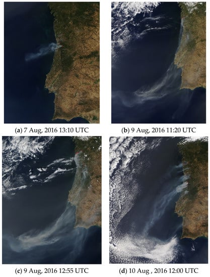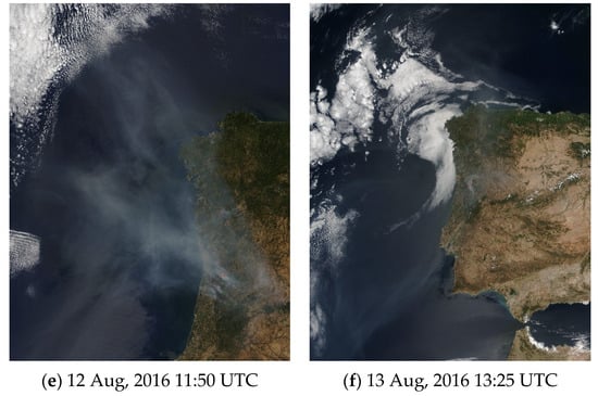 During the first half of August, Portugal battled numerous wildfires, mostly in the Centre and North of the country. Satellites began to detect those large numbers of fires on 6 August. In the following days, the fires grew more numerous, and the amount of smoke increased dramatically (Figure 12), affecting severely air quality. Observations from the AErosol RObotic NETwork (AERONET) (not included in this publication) show that on 13 August the aerosol loading was dominated by particles less than 1 micron—which supports the claim that a significant proportion of the aerosols on that day were from forest fires. Conversely, the data from the 21st and 22nd February show the opposite.