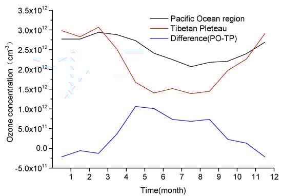 The ozone change and difference curve of the two regions observed by satellite is shown in Figure 1. It can be seen that most of the ozone difference between the two regions occurs in May to August, i.e., the ozone valley in summer, while in December, January and February, the ozone concentration over the Tibetan Plateau is slightly higher than the Pacific Ocean region at the same latitude. As shown in Figure 1, the ozone concentration is low in summer and autumn, but high in winter and spring, regardless of whether the data are from inside or outside the plateau. This is because the height of 18 km is in the lower stratosphere and because the concentration of ozone increases with increasing height. The tropopause rises in summer and autumn and declines in winter and spring [].