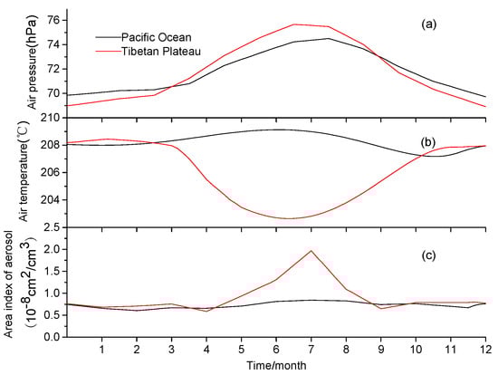 Changes in air pressure (a), temperature (b) and aerosol area index (c) with time at the altitude of 18 km in the lower stratosphere observed by SAGE II (black: the Pacific Ocean region (25–40° N, 140–180° E); red: the Tibetan Plateau (25–40° N, 70–110° E)).