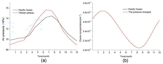 According to the analysis of SAGE II data, the pressure change over the Tibetan Plateau and the Pacific Ocean at the height of 18 km are slightly different. Although the pressure increases in summer and autumn and decreases in winter and spring at both regions, the pressure amplitude of the Tibetan Plateau is slightly larger than that over the Pacific Ocean, as shown in Figure 4a. In winter and spring, the pressure of the Tibetan Plateau is lower than outside the Tibetan Plateau region, but in summer and autumn, it is higher. The model we used contains only chemical processes and does not involve dynamic processes, such as air flow caused by changes in air pressure. It only considers that the air pressure affects the heterogeneous chemical reaction rate by affecting the content of sulfuric acid in the sulfuric acid droplets, thus affecting the chemical equilibrium.