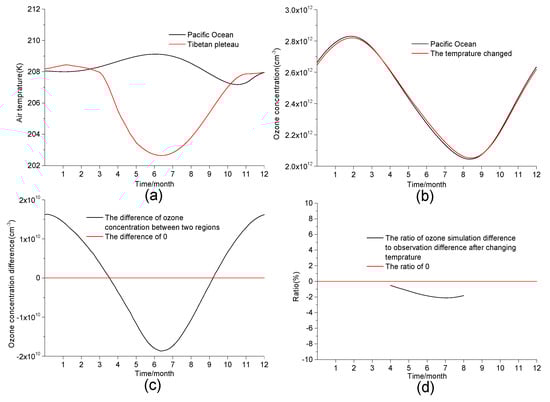The results of air temperature changes (a) time-dependent variations in air temperature in the two regions; (b) simulated comparison of the ozone number concentrations in the two regions; (c) difference in simulated ozone number concentration between the two regions; (d) ratio of the ozone simulation difference to the observed difference after changing temperature.