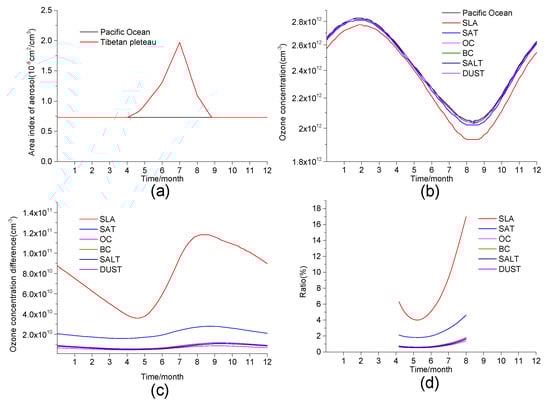 In view of the analysis of satellite data, the aerosol area index in the nonpeak part (outside May to August), which is basically the same in both compared regions, is approximately 0.73 × 10−8 cm2/cm3. Therefore, we default to the fact that the aerosols in the nonpeak part of the Tibetan Plateau are the same as those of the Pacific Ocean region, that the type of aerosols is sulfuric acid droplets, and that the area index is 0.73 × 10−8 cm2/cm3, as shown in Figure 6a. Because there is no exact observation data of the composition and proportion of the ATAL aerosols, the peak of aerosol loading may due to any one of sulfuric acid droplets, solid sulfate, organic carbon, black carbon, sea salt, mineral dust, or a mixture in a certain proportion. To quantitatively estimate the possible effect of any of the heterogeneous chemical reactions on the ozone, we sequentially assume that the peak of the aerosol index is due to a single aerosol (as shown in Figure 6b) and then compare the variation in the ozone difference to determine the maximum influence of aerosols on the ozone valley.