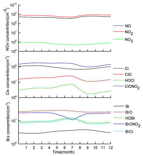 At the same time, the main absorption wavelength of ClONO2 is 196–432.5 nm, and that of NO3 is 472.5–627.5 nm. The wavelengths of solar radiation at the height of 18 km are mainly between 200–735 nm, so the photolysis of ClONO2 and NO3 in the daytime will lead to more intense ozone destruction.