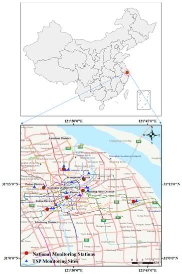 Geographical locations of 17 total suspended particulate (TSP) monitoring sites and 7 national monitoring stations in the urban area of the megacity of Shanghai, China. The blue triangle symbols (▲) represent TSP monitoring sites, which include measurements of TSP concentrations by light scattering and gravimetry, as well as ambient temperature and relative humidity. The red circle symbols (●) represent national monitoring stations which include the measurements of mass concentrations of PM2.5, PM10, SO2, NO2, CO, and O3.