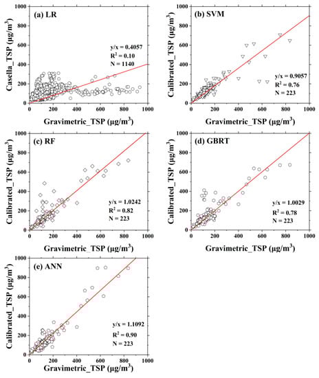 Comparison of TSP concentrations determined by light scattering and machine learning model outputs with those by gravimetric analyses. (a) LR: Linear Regression; (b) SVM: Support Vector Machine; (c) RF: Random Forest; (d) GBRT: Gradient Boosting Regression Tree; (e) ANN: Artificial Neural Network. y/x represents the slope, R2 is the coefficient of determination, N means the volume of the dataset.