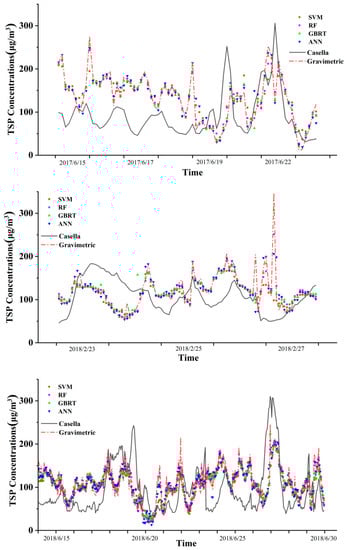 Figure 3 illustrates three examples of time series data obtained from the CaoXi road site, which had the most complete data capture among all 52 TSP monitoring sites. The overall information is shown in Table 4. During the first time period of 15 June 2017 to 22 June 2017, the average TSP concentrations were 92.28 μg/m3 and 132.22 μg/m3 from the Casella raw reading and gravimetric measurement, respectively. The gravimetric over Casella TSP concentration ratios varied from 0.30 to 3.35. The average TSP concentrations by the four machine learning models (SVM, RF, GBRT, ANN) were 132.85, 133.15, 132.53, and 134.04 μg/m3, deviating from the gravimetric mass by less than 1.5%. During the second period of 23 February 2018 to 27 February 2018, the average TSP concentrations were 108.10 μg/m3 and 121.15 μg/m3 from the Casella raw reading and gravimetric measurement, respectively; the average TSP concentrations by the four machine learning models (SVM, RF, GBRT, ANN) were 114.96, 119.92, 120.71 and 119.83 μg/m3, respectively. During the third time period of June 15, 2018 to June 30, 2018, the raw TSP concentrations by the Casella were as high as 236.4–242.8 μg/m3 on June 20, 2018, while the gravimetric TSP concentrations were only 65.3–89.6 μg/m3. The RH values on that day were as high as 90.0%–93.4%. The average TSP concentrations were 94.53 μg/m3 and 107.73 μg/m3 from the Casella raw reading and gravimetric measurements, respectively. The average TSP concentrations by the four machine learning models (SVM, RF, GBRT, ANN) were 104.82–107.96 μg/m3. Overall, all four machine learning methods can fit the result of the gravimetric method. The SVM model performed poorer than the other three models.