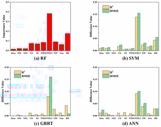Feature importance analysis on ten factors including PM concentrations (PM2.5, PM10, and TSP), gaseous pollutant concentrations (CO, O3, SO2, and NO2), temperature, relative humidity, and the morning hour of the day. (a) Random forest features importance, (b) SVM ablation study, (c) GBRT ablation study, (d) ANN ablation study.