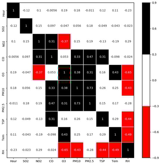 The correlation coefficient between all the input features. The black blocks represent the coefficients higher than 0.3 while the red blocks represent coefficients lower than −0.3. The white blocks represent the coefficients between −0.3 and 0.3.