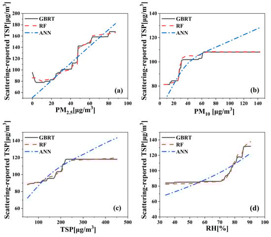 PDPs were generated for RF, GBRT, and ANN. This analysis was not conducted for SVM as it had poorer performances than the other three models and its PDPs had larger biases. Other methods, such as ICE (Individual Conditional Expectation) and ALE (Accumulated Local Effects) plots, are also available to reveal how features affect machine learning model predictions. These methods will be explored in future studies. This study focuses on assessing the different influences on light scattering monitors so we exchanged the input variable “Casella raw TSP readings” and output variable “Gravimetric TSP results” to rebuild the model.