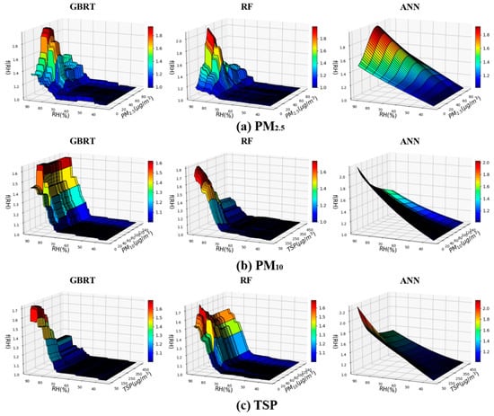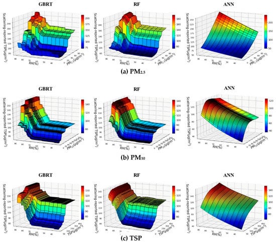 Figure 8 shows the two-way PDP charts between the estimated scattering hygroscopic factor (f(RH)) and PM concentrations (PM2.5, PM10, and TSP) as well as RH for the three machine learning models (i.e., GBRT, RF, and ANN). The hygroscopic curve of RF and GBRT had similar patterns with distinct deliquescence growth at RH ≳ 70%, while that of ANN showed smooth growth without deliquescence growth. The maximum f(RH) values when RH >90% for the ANN were 2.0–2.3, also much higher than the 1.6–2.0 for RF and GBRT. Although both GBRT and RF showed a critical RH of ~70% above which f(RH) showed a significant increase, the trends of f(RH) were different for PM2.5, PM10 and TSP. f(RH) increased with increasing PM2.5 mass concentrations until 40 μg/m3, reached at the maximum value of 1.9–2.1 when RH > 90%, and then decreased with a further increase of the PM2.5 mass concentrations. For PM10, f(RH) increased with increasing PM10 mass concentrations until 50 μg/m3, and then remained at a stable maximum value of 1.6–1.7 when RH > 90%, independent of any further increase in PM10 mass concentration. For TSP, f(RH) reached a maximum of 1.6–1.8 when RH > 90% with a TSP initial mass concentration of 60 μg/m3, then decreased continuously to 1.2 with increasing TSP mass. The different dependence levels of the scattering hygroscopic factor on PM size fractions and concentrations might be related to the different mass fractions of inorganic components such as sulfates and nitrates, which have large hygroscopic growths with distinct growth curves [22]. However, the chemical species percentages in different PM size fractions during the sampling period were not available.
