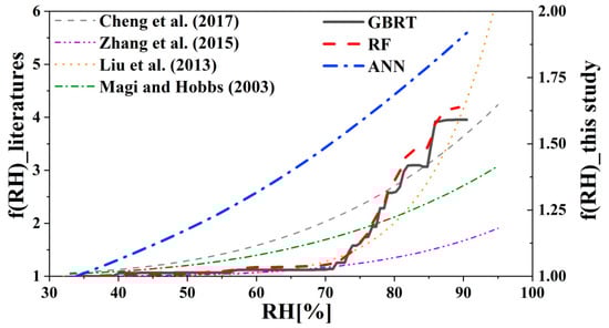 Comparison of scattering hygroscopic growth curves from three machine learning models (GBRT, RF, and ANN) with previous studies. The hygroscopic growth factor f(RH) of this study (marked with the secondary Y-axis) refers to TSP and is estimated by the Casella -reported TSP concentrations at any ambient RH divided by the scattering TSP concentration value when ambient RH was 40%. Previous studies of hygroscopic growth factor refer to PM2.5 and were marked with the primary Y-axis.