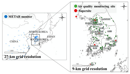 Recently, the local governments in South Korea have been tasked with analyzing the cause of their PM2.5 problems and to prepare their corresponding air quality improvement plans. This means that they need to account for PM2.5 and its precursors due to local emissions with high horizontal resolution as well as the long-range transport of air pollutants. However, the area of a South Korean local prefecture is 382 km2 on average, which is too small to be evaluated at 25–80 km resolutions. At the same time, South Korea itself has very high population densities in many cities along with highly developed industrial complexes, which has resulted in significant local pollution emission contributions toward its own air quality degradation [9,10]. Therefore, it is necessary to perform air quality simulations with a fine-grid resolution to quantify the impact of local source impacts while a coarse-grid resolution is sufficient to estimate the contributions of the long-range transport of pollutants due to remote upwind sources such as Chinese emissions.