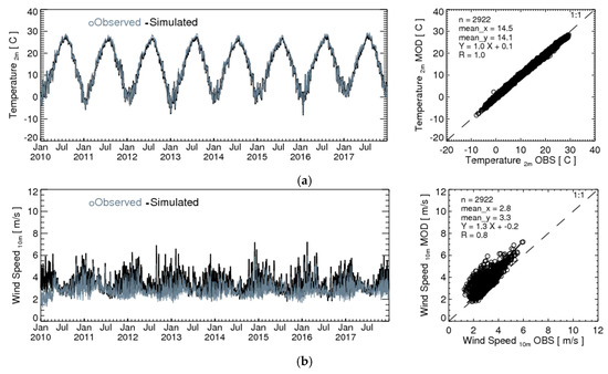 Comparisons of observed and simulated daily mean values of (a) 2-m temperatures and (b) 10-m wind speeds. These values were spatially averaged over 98 METeorological Aerodrome Reports (METAR) sites in South Korea and China.