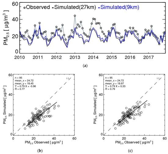 (a) Time series of the monthly means of the observed and the 27- and 9-km simulated particulate matter of 2.5 μm or less in diameter (PM2.5) concentrations averaged across the six supersites in South Korea. Scatter plots of the (b) 27- and (c) 9-km simulations.