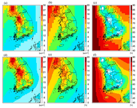 During the modeling period, the average PM2.5 concentrations over South Korea with the 27- and 9-km simulations were 16 and 18 μg/m3, respectively (Figure 4a,d). The PM2.5 concentrations were high in SMA and in a part of Chungcheongnam-do (CCND, a western region in South Korea): ~21 μg/m3 in both simulations. These are likely the results of high mobile emissions in SMA and large point sources for electric generation and petrochemical facilities in CCND [33]. We note that PM2.5 concentrations around the West Sea, which is located close to China, were around 3 μg/m3 higher than the East Sea.