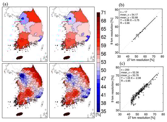 The eight-year mean Chinese contribution to PM2.5 concentrations in 17 provinces (a-top) and 250 prefectures (a-bottom) in South Korea estimated via the 27- (a-left) and 9-km (a-right) simulations from 2010 to 2017. Scatter plots of the Chinese contribution estimated via the 27- and 9-km simulations for (b) the 17 provinces and (c) the 250 prefectures.