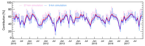 The discrepancies in the spatially averaged monthly Chinese contribution between the 27- and 9-km simulations were consistent except in July–September when low PM2.5 concentrations and the Chinese contribution were estimated. In general, the monthly Chinese contribution via the 27-km simulation was 5–10% higher than via the 9-km simulation. These results suggest that the Chinese contribution estimated via the two simulations can vary not only in space but also in time. In summary, when air quality improvement plans are developed based on simulations with a higher grid resolution (i.e., 9 km), more detail of the source-receptor relationship at a local level should be examined. For this reason, we analyzed the results of the 9-km simulation, as reported in the following sections.