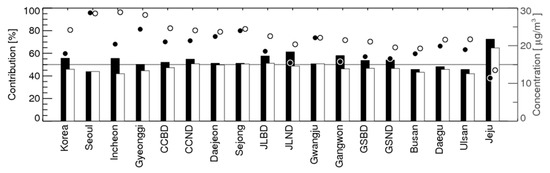 The eight-year average PM2.5 concentrations (circles) and the Chinese contribution (bars) in the 17 provinces via the 9-km simulation. The black and white colors represent the area-based and monitor location-based Chinese contribution, respectively.