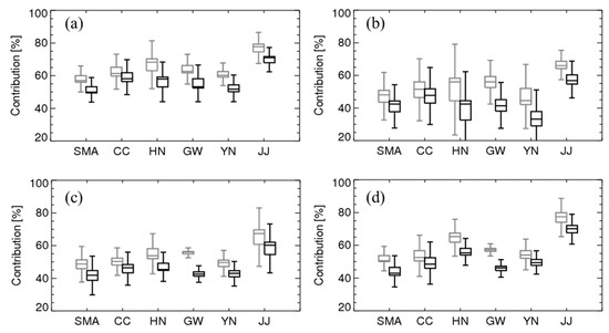 Variations in the Chinese contribution to seasonal mean PM2.5 concentrations in the high-tier government boundaries in South Korea from 2010 to 2017 estimated via the 9-km simulation: (a) spring (March–May), (b) summer (June–August), (c) autumn (September–November), and (d) winter (December–February). The gray and black boxes represent the area-based and the monitor location-based Chinese contribution, respectively.