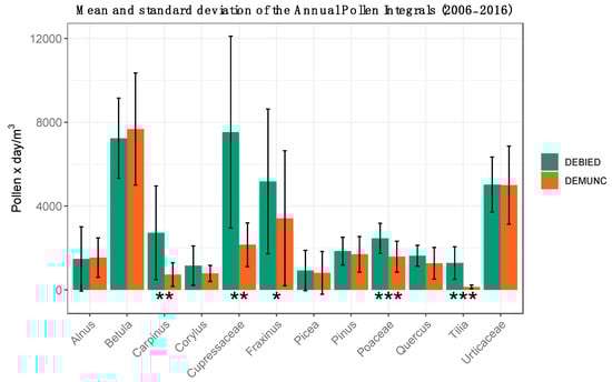 - Werchan, B.; Werchan, M.; Mücke, H.-G.; Gauger, U.; Simoleit, A.; Zuberbier, T.; Bergmann, K.-C. Spatial distribution of allergenic pollen through a large metropolitan area. Environ. Monitor. Assess. 2017, 189, 169. [Google Scholar] [CrossRef]